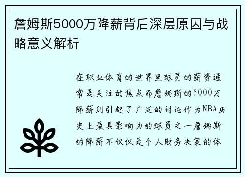 在职业体育的世界里,球员的薪资通常是关注的焦点,而詹姆斯的5000万降薪则引起了广泛的讨论。作为NBA历史上最具影响力的球员之一,詹姆斯的降薪不仅仅是个人财务决策的体现,更是背后战略布局的体现。本文将从四个方面深入解析詹姆斯降薪的深层原因与战略意义,分别探讨其个人品牌、球队竞争力、薪资空间优化以及未来规划等方面的影响。通过这一分析,能够更好地理解詹姆斯如何通过此举做出更长远的职业布局与战略思考。